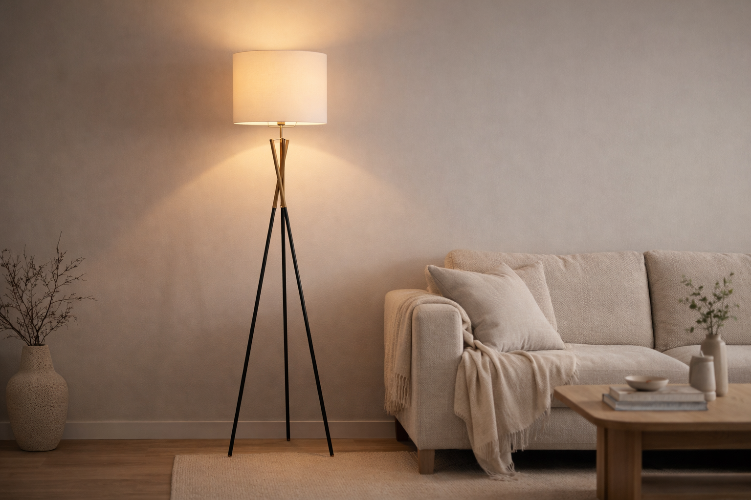 Lampa podłogowa na trójnogu z cylindrycznym abażurem z tkaniny